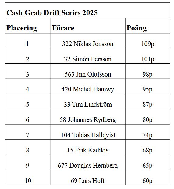 Överst i kvalet fick vi se en förare som besökte banan för första gången. Michel Hamwy som trots bristen på sömn satte en riktigt fin kvalrunda med 94p och knep översta kvalplatsen före Niklas Halo Jonsson på 92p och Jim Olofsson på 91. Riktigt kul att en förare som aldrig tidigare kört banan lyckas ta en topplacering före förare som nött banan tidigare.