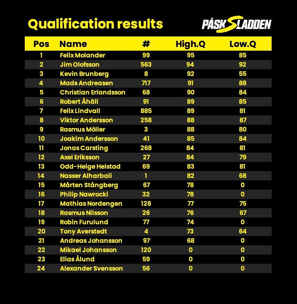 Med ett par riktigt stabila och helt odramatiska repor kvalade Felix Molander in som 1a med 95p i årets påsksladd, en poäng före fjolårets segrare Jim Olofsson på 94p och 3 poäng före Volvokungen Kevin Brunberg 92p. Top 3 var så stabila att det mer såg ut som om de var på väg till jobbet en onsdagmorgon än ett kval fullspäckat med toppförare, “steady pace wins the race”.