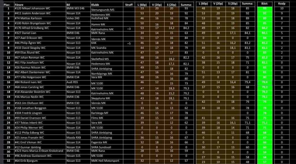 Det såg länge ut som att både 1an och 2an i årets SM-serie låg illa till och det var nästan snudd på att båda skulle stå utanför morgondagens top-32a. SM-Ledaren Gunnar Jämting nollade i sin första repa och Jonathan Berggren skrapade ihop en 62p, något som inte på något sätt säkrade en plats i morgondagens körningar. Kval1an i SM-klassen blev inte direkt förvånande Mikael Johansson 93p som redan under sin 1a träningsrepa hade kunnat kvala till top3. Kval2a Jocke Andersson 92p som har sett stabil ut under hela dagen och på en 3e kvalplats hittar vi Mattias Karlsson som klättrade från en 17e till en 3e plats med 89p. Både Jämting och Berggren kvalade till Lördagens 32a på en 29e och 21a plats.