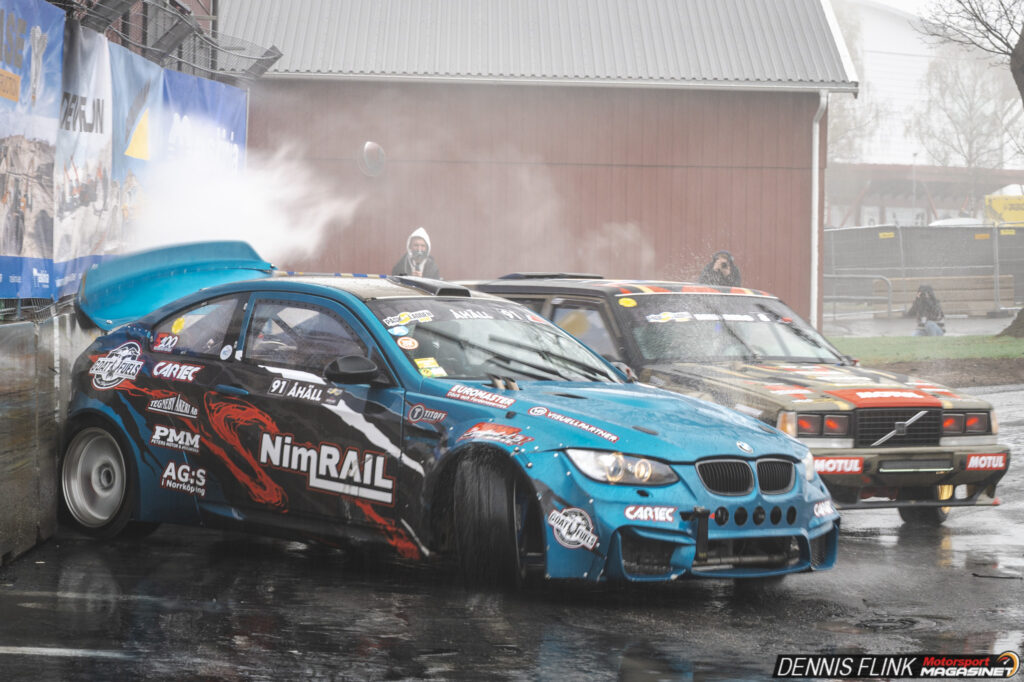 Vädrets makter var inte riktigt med oss denna helg. Det stod tidigt klart att tävlingen skulle nå sitt slutmål genom blöta förhållanden. Fördelen var att det skulle regna konstant så förarna skulle inte utsättas för några upptorkande förhållanden som på påskaftonens top16 vilket då gav ett väldigt varierande grepp.